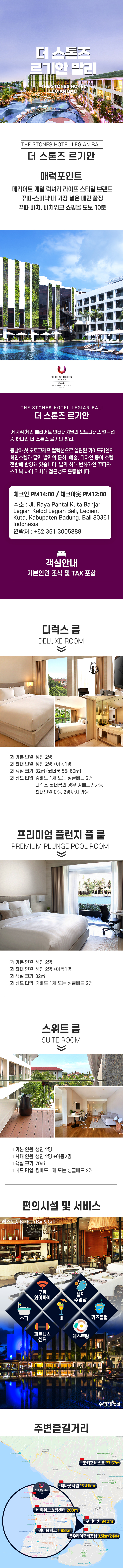 - 서비스 : 24시간 룸서비스, 24시간 프런트 데스크, 스파, 야외수영장(아동 수영장), 비즈니스센터, 레스토랑, 바(BAR), 풀 사이드 바, 키즈클럽, 무료 Wi-Fi