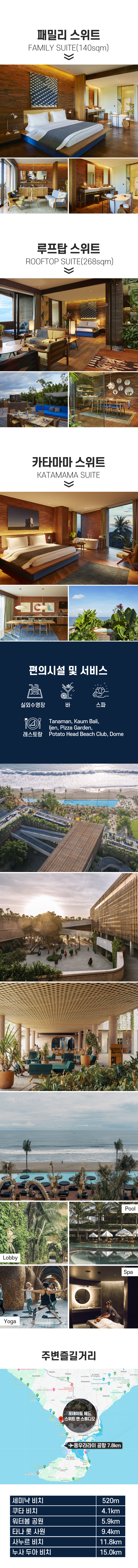 스튜디오 구역은 고급스러운 분위기와 현대적인 편의시설로 휴식을 취할 수 있는 공간을 제공하며, 스위트 구역은 럭셔리하고 아름다운 객실로 특별한 숙박 경험을 선사합니다. 해변가에 위치한 비치클럽 구역은 해변을 바라보며 휴식을 취할 수 있는 곳으로, 수영장과 레저 시설을 갖추고 있습니다. 더 웜 구역은 현대적이고 스타일리시한 분위기를 가진 곳으로, 고급스러운 객실과 다양한 편의시설을 제공합니다. 포테이토 헤드 비치클럽은 이국적인 해변 휴양지에서 완벽한 휴식을 제공합니다. 세 가지 수영장 중 하나인 포테이토헤드비치클럽 수영장은 고급스러운 분위기와 함께 편안한 휴식을 취할 수 있는 곳으로, 해변을 바라보며 여유를 즐길 수 있습니다. 또한 포테이토헤드스위트 수영장은 스위트 투숙객만을 위한 프라이빗한 공간으로, 프라이빗한 분위기에서 수영을 즐길 수 있습니다. 마지막으로 포테이토헤드비치클럽 비치프런트 수영장은 해변가에 위치하여 석양을 감상하며 특별한 순간을 만들 수 있는 곳입니다.