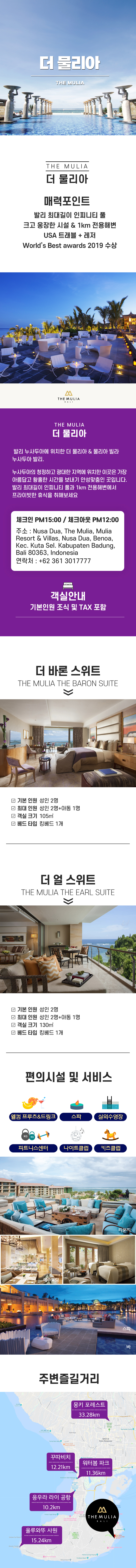 ● 호텔 소개 📌 물리아 대단지 : " 물리아리조트 + 더물리아 + 물리아빌라스 " 물리아 발리는 그 어마어마한 규모와 럭셔리한 시설로 발리를 대표하는 랜드마크 리조트 중 하나입니다. 리조트는 누사두아 해변을 따라 무려 30헥타르(약 9만 평) 로 약 42개의 축구장 정도의 엄청난 규모를 자리하고 있으며, 숙박 시설로는 물리아 리조트(526개)의 객실뿐만 아니라 더 물리아(111개, 스위트룸)와 물리아 빌라스(108채, 풀빌라)로 구성되어 있습니다. 리조트 내에는 정원과 함께 피트니스 센터, 키즈 클럽, 물리아 SPA 등 다양한 부대 시설과 서비스가 제공됩니다. 리조트 내에서는 깔끔한 시설과 세심하게 가꿔진 정원을 경험할 수 있습니다. 직원 수도 숙박객 수를 능가하는 약 2000여 명에 이릅니다. 이들은 고객들의 편안한 휴식을 위해 최선을 다하며, 어디에서나 이들의 세심한 노력을 느낄 수 있습니다. 특히 해변을 향해 눈을 돌리면 물리아의 시그니처인 6미터 높이의 석상과 함께 인피니티 풀과 바다가 어우러지는 풍경이 고객들의 눈을 즐겁게 만듭니다. 풀 한가운데에 위치한 바에서는 천국 같은 풍경을 감상하며 여유로운 시간을 보낼 수 있으며, 숙박하는 객실에 따라 고객 개인에 맞춘 서비스도 제공됩니다. 📌 더 물리아 (The Mulia) : ★ 허니문 인기 리조트 더 물리아 리조트는 발리의 누사두아 해안에 자리하고 있으며, 그 독특한 고급스러운 디자인과 세련된 인테리어로 여행객들에게 꾸준한 인기를 얻고 있습니다. 이 리조트는 각 스위트 룸마다 개성과 테마를 담고 있습니다. 더 물리아 리조트의 객실은 고객의 편안함을 최우선으로 고려하여 섬세하게 설계되었고, 객실 내부는 편안하고 아늑한 분위기를 조성하기 위해 고급 가구와 현대적인 시설로 꾸며져 있습니다. 일부 객실에는 개인용 수영장이나 자쿠지가 마련되어 있어 특별한 순간을 만들어줍니다. 이를 통해 고객들은 여행 동안 편안하게 쉬면서도 특별한 경험을 즐길 수 있습니다. 고객 개인에게 맞춘 세심한 서비스와 친절한 스태프들은 허니문 여행을 더욱 특별하고 로맨틱하게 합니다. 여행객들은 이곳에서 지친 일상을 잊고 휴식과 로맨틱한 분위기를 누릴 수 있으며, 더 물리아 리조트는 특별한 순간을 즐기고 싶은 이들에게 완벽한 휴식처가 될 것입니다.