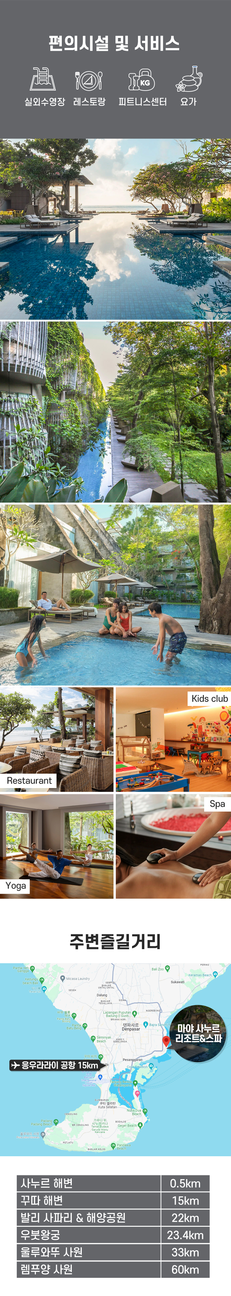 발리를 상징하는 허니문여행객뿐아니라 , 가족 단위의 여행객들의 만족도가 높은 호텔로 호텔내 다양한 액티비티 프로그램들과 키즈클럽에서의 활동들은 아이들에게 좋은 추억을 줄 수 있습니다. 마야 사누르 리조트 앤 스파 는 발리의 자연미와 현대적인 럭셔리를 동시에 느낄 수 있는 곳으로, 모든 투숙객에게 잊을 수 없는 휴양 경험을 제공합니다.