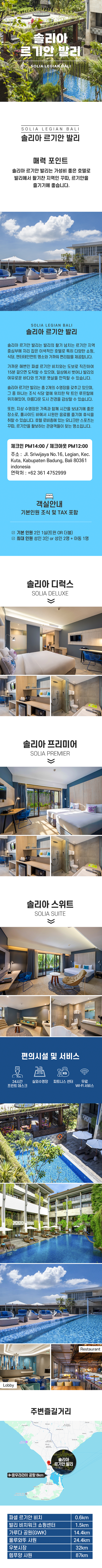 솔리아 르기안 발리(Solia Legian Bali)는 현대적인 느낌의 시설과 아담한 객실을 보유한 호텔로,아침 조식당에서 맞이하는 발리전통의 주황색 지붕이 이색적인 곳입니다.