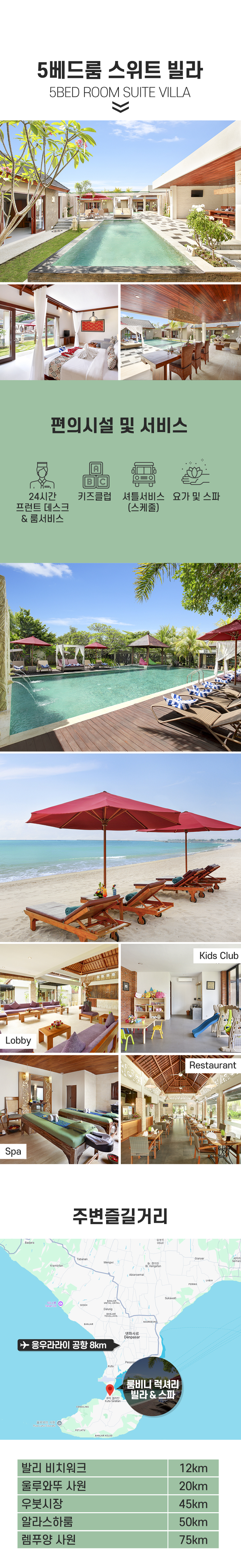 리조트에서는 웰니스 중심의 다양한 프로그램을 즐길 수 있습니다. 스파 트리트먼트, 요가 클래스, 맞춤형 식사를 제공하는 셰프 서비스까지 투숙객들에게 특별한 경험을 선사합니다. 또한, 24시간 운영되는 프런트 데스크와 친절한 컨시어지 서비스가 발리에서의 여정을 더욱 편안하고 즐겁게 만들어줍니다. 또한 짐바란 해변과 가까운 최적의 위치에 자리 잡고 있어 아름다운 일몰 감상, 신선한 해산물 요리를 즐길 수 있는 유명 레스토랑, 그리고 발리의 활기찬 문화를 체험하기에 안성맞춤입니다. 고요한 휴식과 다채로운 경험이 공존하는 발리의 숨은 보석, 룸비니에서 잊지 못할 추억을 만들어보세요.