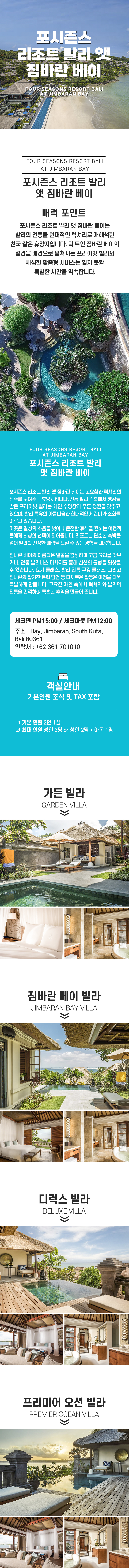 발리의 천혜 자연과 전통의 아름다움을 품은 포시즌스 리조트 발리 앳 짐바란 베이(Four Seasons Resort Bali at Jimbaran Bay)는 진정한 휴식과 품격을 선사하는 럭셔리한 장소입니다. 전용 풀을 갖춘 프라이빗 빌라에서의 생활은 투숙하는 이들에게 발리에 대한 더욱 틀별한 추억을 만들어 줍니다.