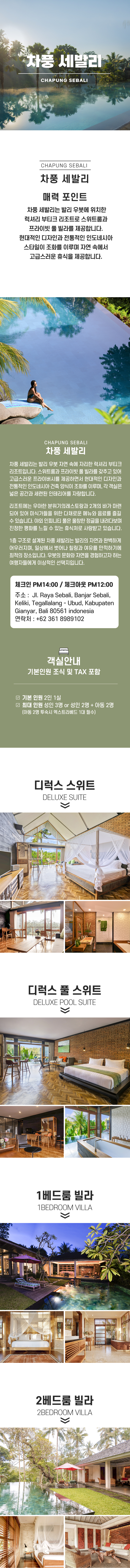 차풍 세발리(Chapung Sebali)는 발리 우붓의 푸르른 자연 속에 자리한 럭셔리 부티크 리조트입니다. 스위트룸과 프라이빗 풀 빌라를 갖추고 있어 고급스러운 프라이버시를 제공하는 이 곳은. 현대적인 디자인과 전통적인 인도네시아 건축 양식이 조화를 이루며, 각 객실은 넓은 공간과 세련된 인테리어를 자랑합니다.