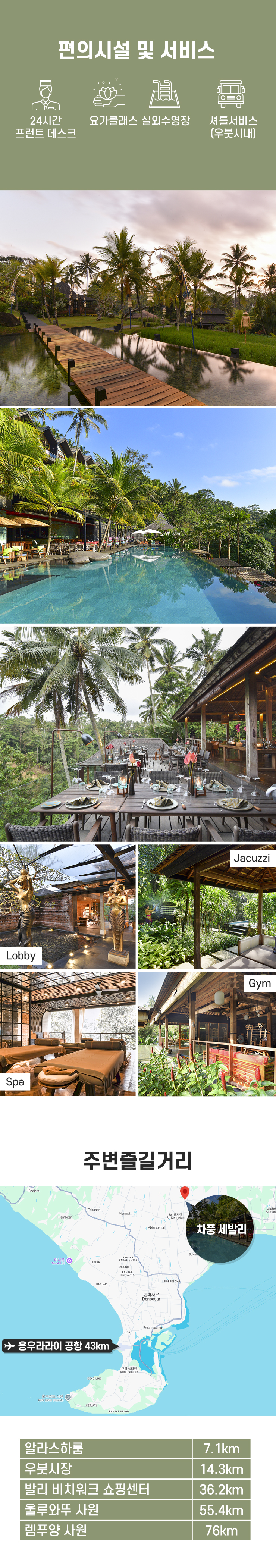 * 서비스 : 24시간 프런트 데스크, 요가 클래스, 세탁 서비스, 셔틀 서비스(우붓시내)